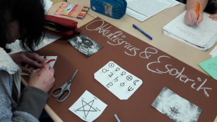 Uns standen insgesamt 7 Unterrichtsstunden zur Verfügung, 5 Stunden nutzten wir zur Recherche, die beiden letzten Stunden wurde vorgetragen und ausgewertet. Wir wurden in Gruppen eingeteilt, jede Gruppe hatte ein anderes Thema. Zu dem jeweiligen Thema sollten wir dann ein Plakat erstellen, um den Zuhörern die einzelnen Themen näher zu bringen bzw. um sie besser zu veranschaulichen. Die Vorträge waren allesamt sehr interessant und gut gemacht. Uns standen 5 Themen zur Auswahl. Die Themen lauteten wie folgt: - Okkultismus & Esoterik